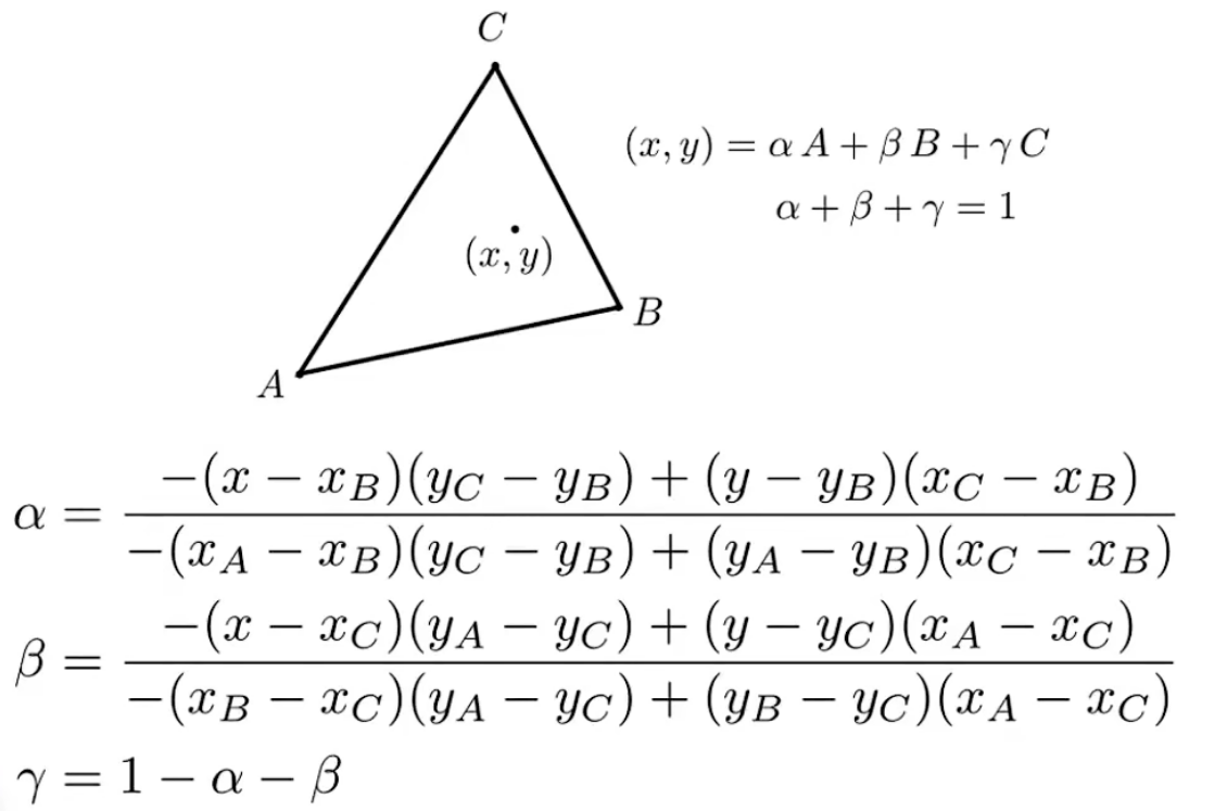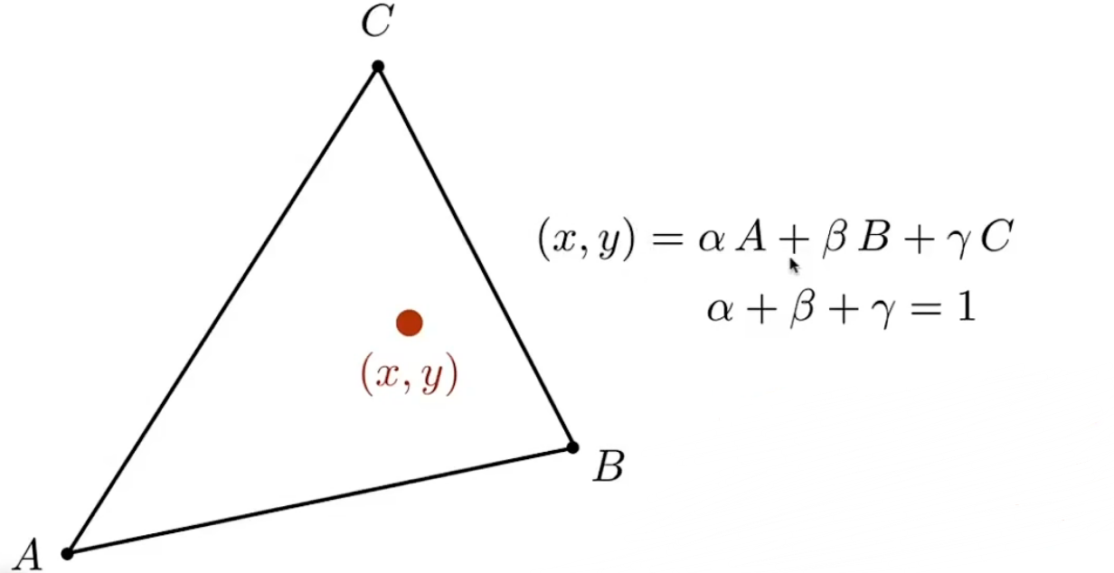 +三角形所在平面上的任一点(x, y)都可以用 $(x, y) = \alpha A + \beta B + \gamma C$ 且 $\alpha + \gamma + \beta = 1$
