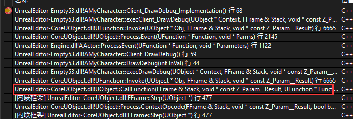 +| 客户端直接调用 Server_DrawDebug_Client | ![](Image/008.png) | ![](Image/012.png) | 通过服务器 RPC 调用本地函数,由于是 `Client` 类型,所有只有 客户端 1 绘制了球体 |