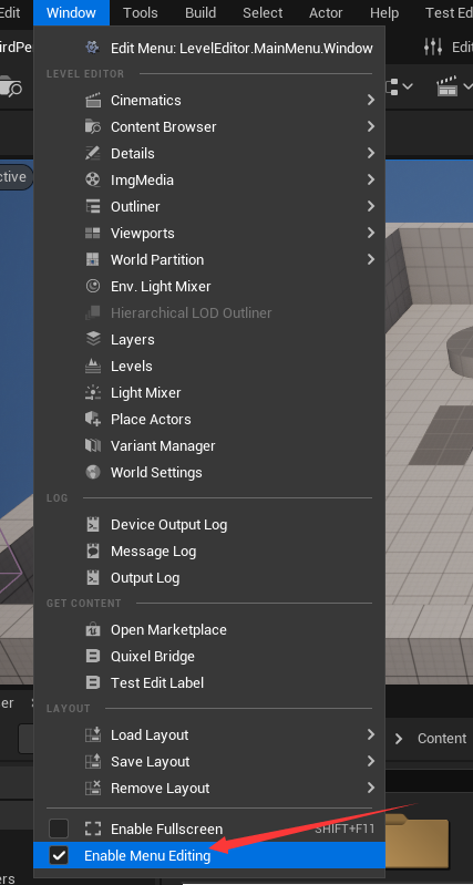 +在 `Window` 窗口中选择开 `Enable Menu Edition` 即可开启调试