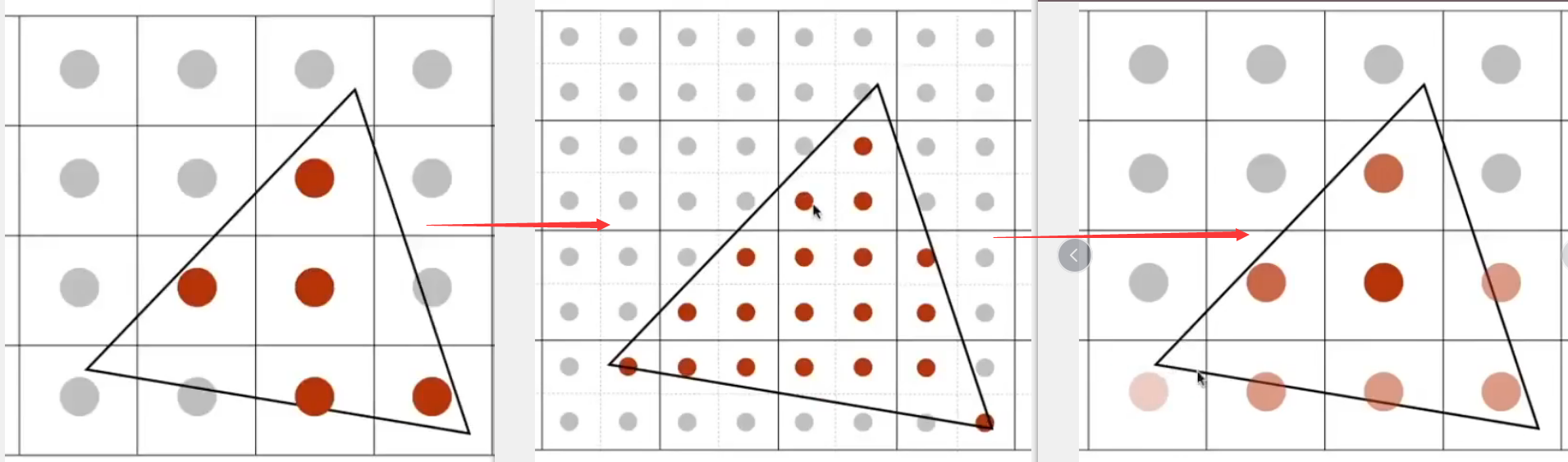 +将一个像素,分成若干个小的像素(图中是将一个像素分成4*4,黑色的点表示各个小像素的中心点),然后再判断各个小像素的中心点是否在三角形中,再把判断结果平均一下,就能得到当前像素百分之多少在三角形中的**近似值**