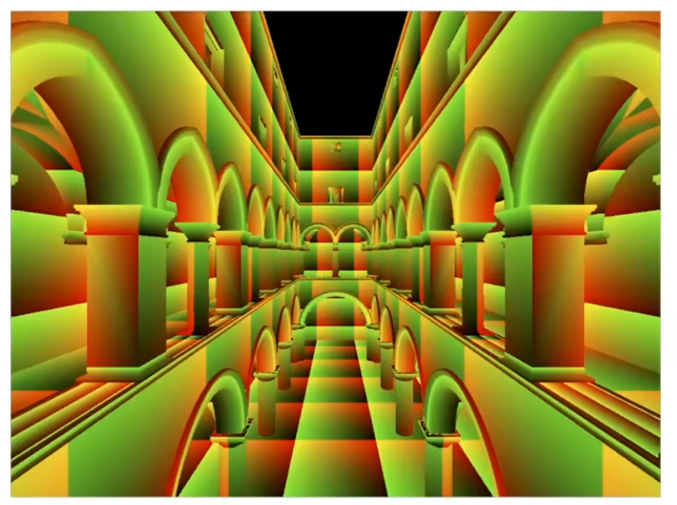 +对于漫反射的计算来说 $L_d = k_d (I / r^2) (\vec{n} \cdot \vec{l})$,上述图片就是球的每个点的 $k_d$ 是不同的