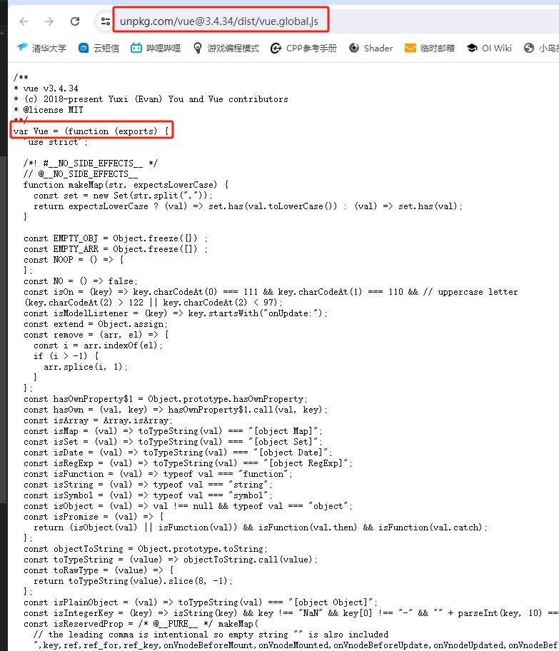 +以当前官网推荐的 `CDN` 地址为例,从源码上看可以发现 `VueJS` 定义了一个全局变量 `Vue`,很多功能都是直接通过这个全局对象进行操控的