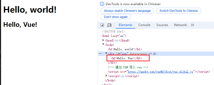 +通过 `Vue.createApp` 创建了一个 `Vue` 对象,再通过 `id` 将对象绑定到 `<div id="app">` 中