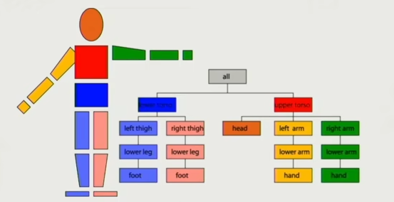 +因为关节骨骼是树状结构,所以也叫 `Hierarchical`,也就是一层一层一级一级的分布下来