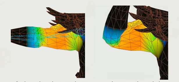 +如果只是单纯的将 Mesh 和 骨骼 进行绑定,那么很容易出现上图的的问题,那就是 Mesh 与 Mesh 之间出现重合,也就是俗称的穿模