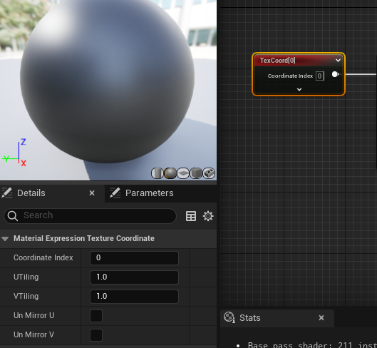 +使用 **U + 鼠标左键** 即可快速创建 `TexCoord 节点`,该节点的作用是可以帮助调整纹理的位移、尺寸、平铺次数、动态变化等,该节点只针对材质中的纹理坐标,不会影响被赋予材质的模型的UV坐标