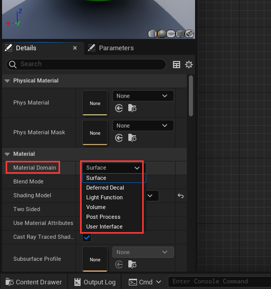 +| Surface | 表面材质,对场景对象赋予表面质感的效果。包括透明材质、半透明材质、次表面材质、皮肤材质、布料材质等。这种材质域可以在3D场景中对物体表面进行着色、贴图和照明计算。Surface材质可以用于渲染静态网格、角色模型和许多其他场景元素 |