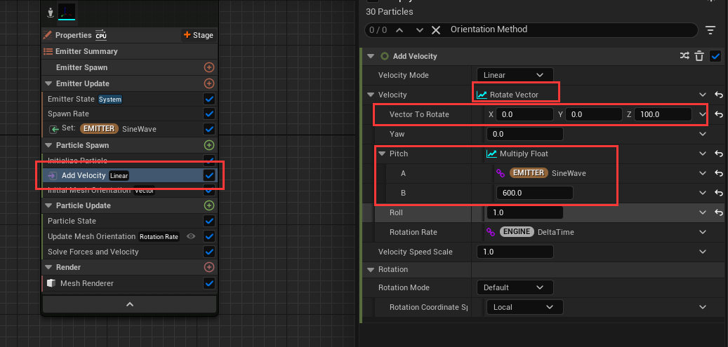 +最后就是在 `Particle Spawn` 的时候,设置其速度为 `Rotate Vector`