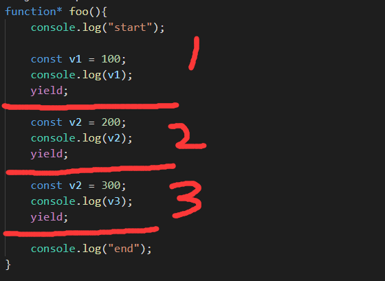 +`yield v1;`表示返回生成器的值为`v1`的值