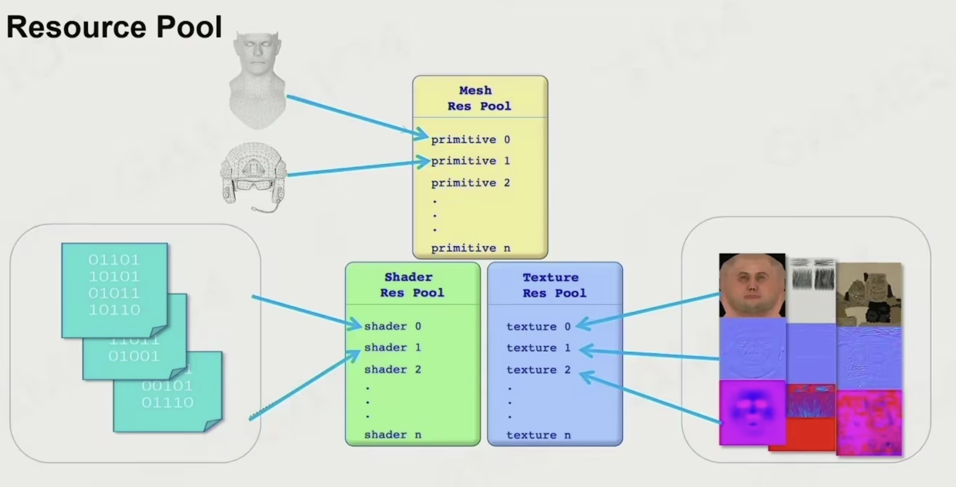 +现代游戏引擎中,一般的做法是建立 Pool:`MeshResPool`、`ShaderResPool`、`TextureResPool`,那么即使场景中有多个相同的Mesh,其对应的内存数据也只用存储一份即可