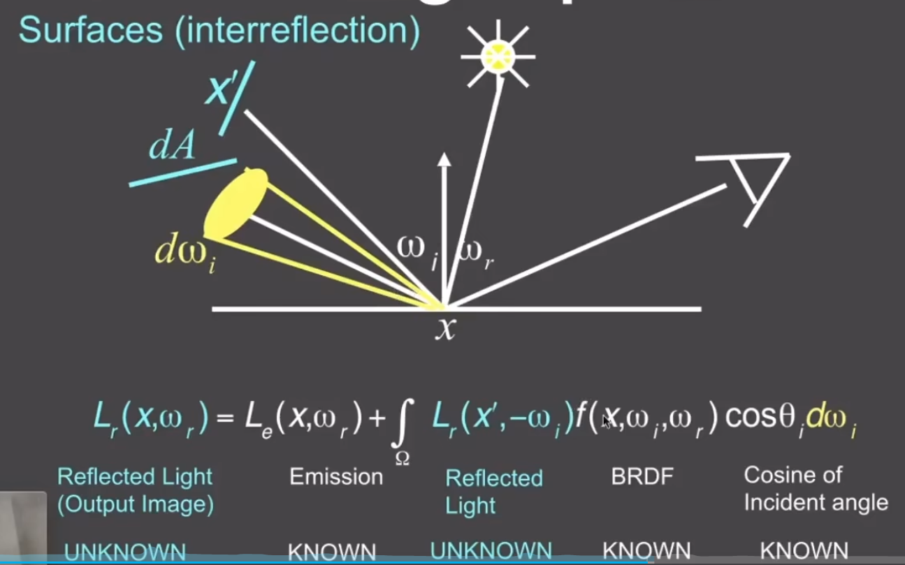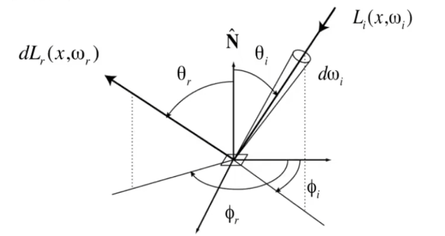 +相机方向就是指定的出射方向,单位面积 $dA$ 会从很多方向收到光照,每个入射光线在指定的出射方向都可以通过BRDF计算,把每个方向对出射方向的计算相加,得出单位面积 $dA$ 在所有的入射光下最后反射到指定方向上的样子