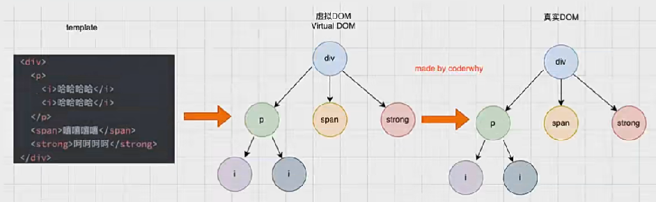 - 因为 `Vue` 的 `template` 会先生成 `vdom` 再渲染为真实 `Dom`