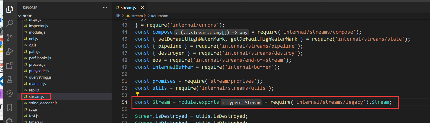 可见 Stream 是从 lib/internal/streams/legacy 中导出的,查看该文件可得