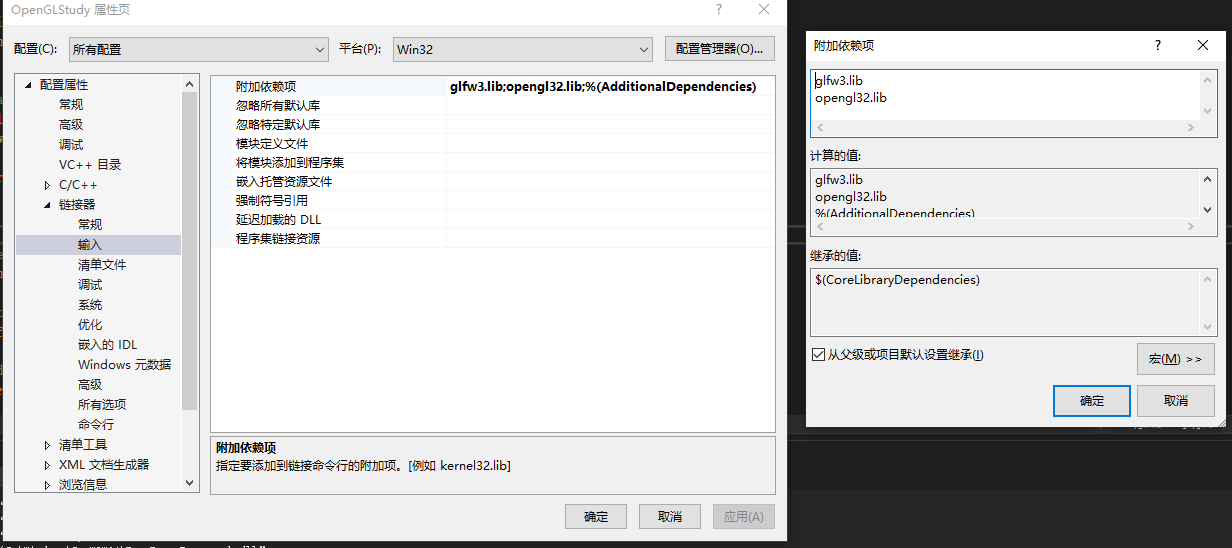 在输入中指明使用 glfw3.lib 和 opengl32.lib,因为 GLFW 中提供了多个 lib 和 dll,所以指定使用一个