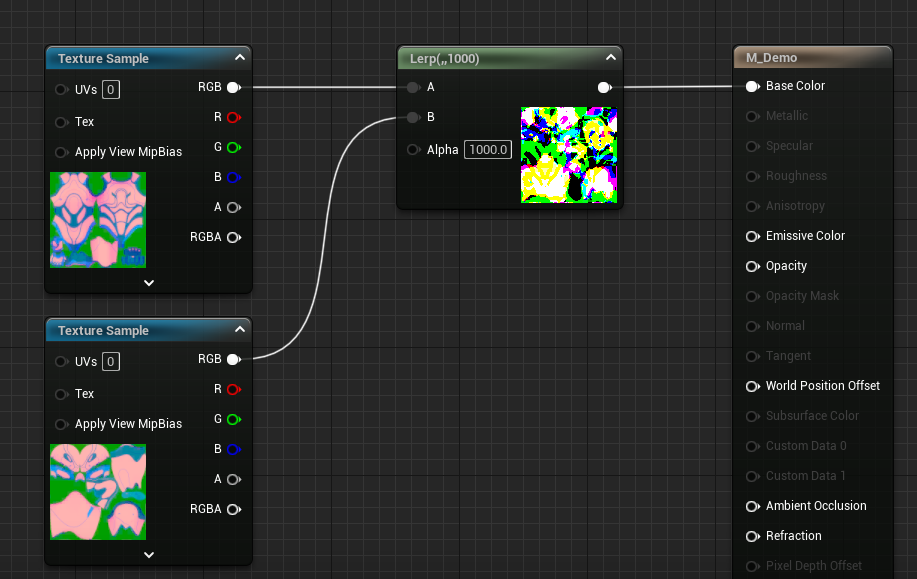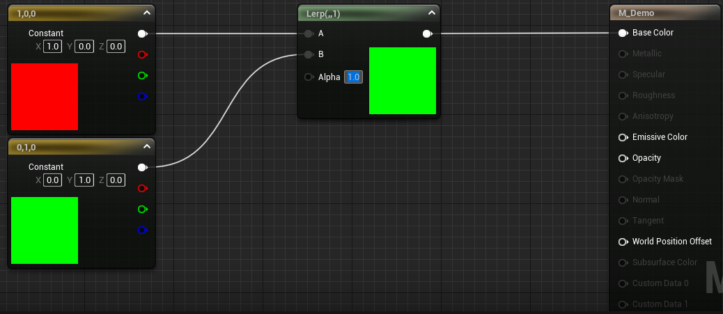 作用其实很简单就是将 输入口 A 的值 和 输入口 B 的值进行一个线性插值,比如这里是 Alpha 配置的是 0.5,其实就是 A * (1 - 0.5) + B * 0.5