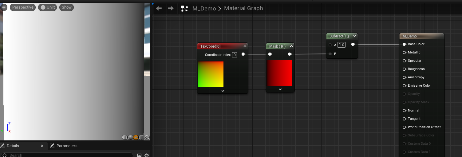 以上图为例,原本的 TexCoord 的数组是从 0~1 的,加上 Bias 配置的 -0.5 之后,得到的是一个 -0.5~0.5 的数组,然后乘以 Scale 配置的 0.5,最后得到一个的是一个 -0.25~0.25 的数组,这也就最后左边预览显示的效果