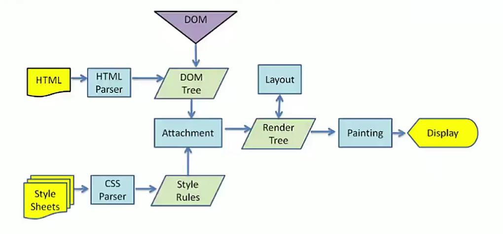 HTML Parser把HTML文件解析成DOM TreeDom进行操作从而修改Domt Tree,这执行Javascript代码就是js引擎CSS Parse解析成Style Rulescss规则Style Rules和Dom Tree结合(Attachment)到一起,生成渲染树(Render Tree)Painting)到界面上显示(Display)出来JavaScript代码通过JavaScript引擎来执行