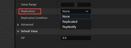 当选择 RepNotify 时,蓝图中会自动生成一个名为 OnRep_属性名 的一个函数,该函数作为回调函数