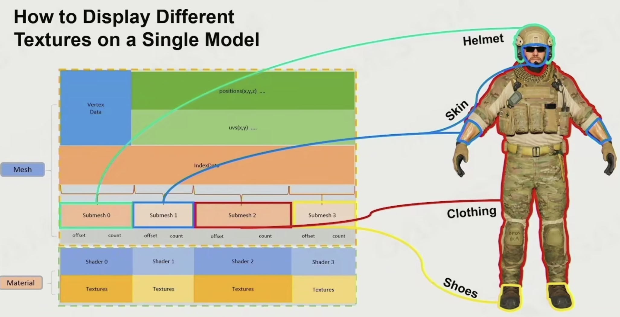 抽象来看就是:将整个 Mesh 抽成了一个大buffer, 每个 submesh 只用了 buffer 中的一部分;每个 submesh 有对应的材质、贴图、shader