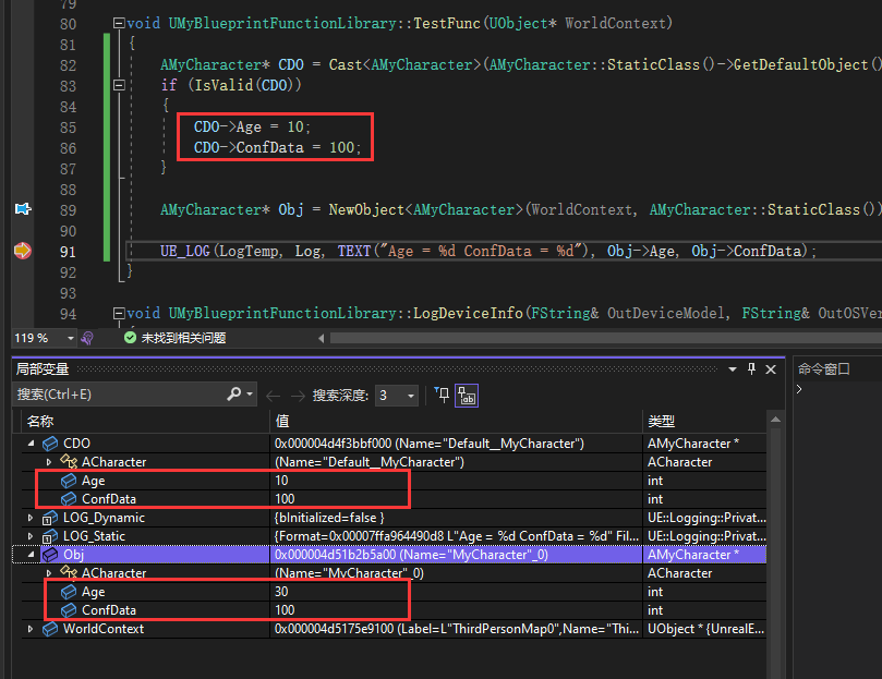 Obj->Age 的值仍然为 30,这就是前面说的一般情况数据不从 CDO 复制Obj->ConfData 的值被修改为 100,这是因为 UPROPERTY 设置 config,也就是从 ini 文件中获取配置值,总不能每次创建对象都读取和解析 ini 文件吧,从 CDO 中获取是最快最合理的在不使用 bCopyTransientsFromClassDefaults 的情况下,只有 UPROPERTY 中配置了 config 的属性,才会在初始化的时候从 CDO 拷贝属性值,其他属性不会从 CDO 中拷贝属性值