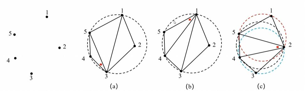 如上图所示,左边的三角形满足第三点,每个三角形的外接圆只包含该三角形的三个点。右边的三角形不满足第三点,一个三角形外接圆包含除了三角形三点之外的其他点