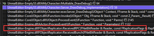 | 情况 | 调用堆栈 | 表现效果 |理解 | | --- | --- | --- | --- | | 客户端直接调用 Server_DrawDebug | | | 通过 NewMultiCast 所有客户端和服务器都执行了 DrawDebug 函数,所以客户端 1、2 都绘制了黑色球体 | | 客户端直接调用 Client_DrawDebug | | | 没有经过服务器,完全是本地执行逻辑,所以只有客户端 2 绘制了球体 | | 客户端直接调用 Multiable_DrawDebug | | | 没有经过服务器,完全是本地执行逻辑,所以只有客户端 2 绘制了球体 | | 客户端直接调用 Server_DrawDebug_Client | | | 通过服务器 RPC 调用本地函数,由于是 Client 类型,所有只有 客户端 2 绘制了球体 |