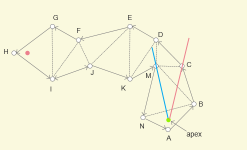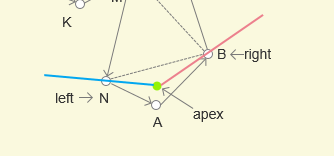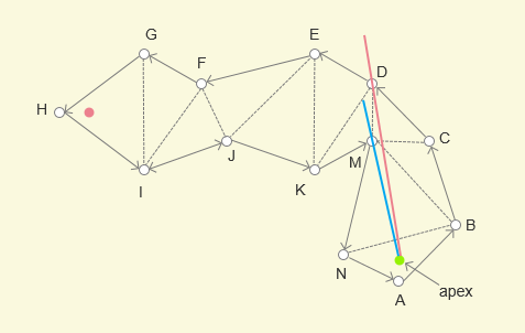 绿点作为起点,被包括在三角形 ABN 中,首先定位到下一个三角形是 NMB,那么公共边 NB 是一定要经过的,所以将 XN 作为左边界,XB 作为右边界,形成一个漏斗形状
