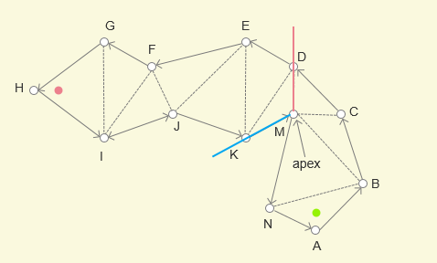 BCM 边界上,N 没有,所以先动 左边界 XN,左边界变成 XMXM 和 XB 形成的漏斗比原来小,则 XM 形成新边界XB 变更为 XC,由于 XM 和 XC 形成的漏斗更小,所以右边界变更为 XCKMD 边界上,所以先动 C 点,也就是右边界XD 和 XM 形成的漏斗更小了,所以右边界更新为 XDXM 更新为 XK,由于 XK 和 XD 形成的漏斗变大了,所以 XK 更新失败,退回到 XMXE 超过了左边界 XM,所以更新目标点,从 X 点变为 M 点,并将 M 点添加到最短路径中MD 更新为 ME,角度减少,右边界更新成功,变为 MEMK 更新为 MJ,角度减少,左边界更新成功,变为 MJME 更新为 MF,角度减少,右边界更新成功,变为 MFMJ 更新为 MI,角度增加,左边界更新失败,保持为 MJMF 更新为 MG,角度增加,右边界更新失败,保持为 MFMJ 更新为 MY (Y是终点),角度减少,左边界更新成功MF 更新为 MY (Y是终点),角度减少,右边界更新成功那么最短路径也就确定了,从 X(起点) -> M -> Y(终点)