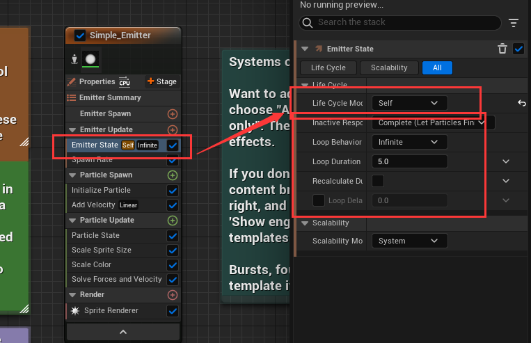 以 Emitter 的 Life Cycle Mode 为例,在 Simple_Emitter 粒子发射器中,有一个 Emitter State 粒子状态,可以通过这个设置 Life Cycle Mode 粒子的生命循环模式:System 或者 Self