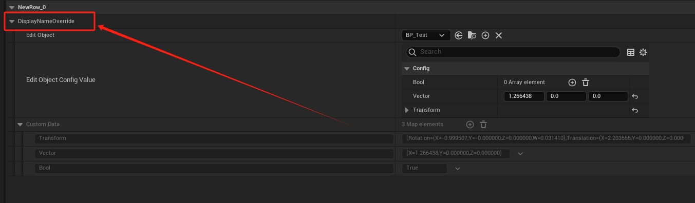如上图所示,设置面板不仅 CustomData 不可手动修改,并且增加了一个名为 Edit ObjectCOnfig Value 的修改面板,其内容对应的就是 BP_Test 中的内容