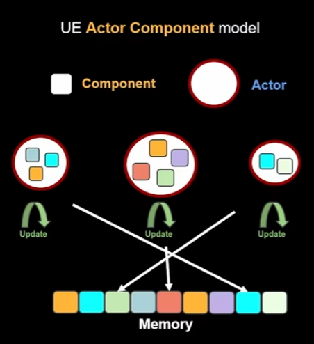 上图说明的就是经典 Actor 的处理方式,通过 update 更新每个 Actor 及其对应的组,这种更新访问的是零碎的内存空间