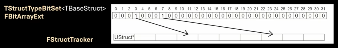 可以看到上面代码中使用了很多了 BitSet,对应的机理就是将各个结构的 UStruct 类型信息存在一个数组里,然后把数组的下标当作 BitSet 的下标