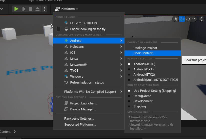 点击按钮, Cook 烘焙资源,在 项目路径/Saved/Cooked/Android_ASTC/ 中会存储本次烘焙的结果,并按照引擎和项目资产进行区分