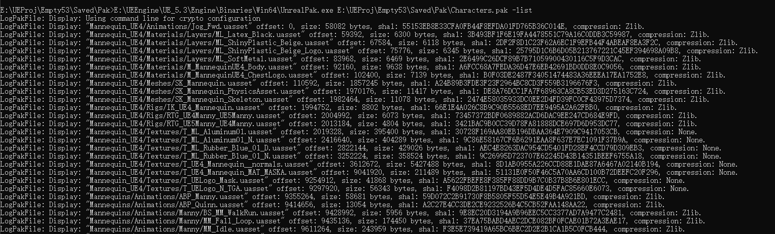 使用 E:\UEEngine\UE_5.3\Engine\Binaries\Win64\UnrealPak.exe E:\UEProj\Empty53\Saved\Pak\Characters.pak -list 可以解析出 Pak 中文件列表