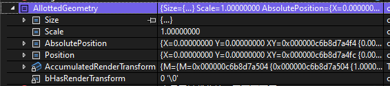 Size: 表示控件在本地空间(Local Space)中的大小,即控件自身坐标系中的宽度和高度。这个字段主要用于描述控件的内部布局和尺寸Scale: 表示控件的缩放因子。这个字段用于描述控件在屏幕空间(Screen Space)中的缩放程度。这个值是累积的,包括了控件本身以及其所有父控件的缩放AbsolutePosition: 表示控件在屏幕空间中的位置,即控件相对于屏幕或应用程序窗口的左上角的坐标。这个字段主要用于描述控件在屏幕上的位置Position: 表示控件在本地空间中的位置。这个字段主要用于描述当前控件相对于其父控件的位置。AccumulatedRenderTransform: 表示从控件的本地空间到屏幕空间的累积渲染变换。这个变换包括了控件本身以及其所有父控件的渲染变换。这个字段主要用于在渲染过程中对控件应用复杂的变换,例如旋转、缩放和平移等bHasRenderTransform: 一个布尔值,表示控件是否具有渲染变换。这个字段用于在需要时快速检查控件是否具有渲染变换,以便在渲染过程中进行相应的处理在 Slate 框架中,通常需要在本地空间和屏幕空间之间进行坐标转换。例如在处理控件的布局和点击事件时,需要将本地空间中的坐标转换为屏幕空间中的坐标,以便确定控件在屏幕上的实际位置