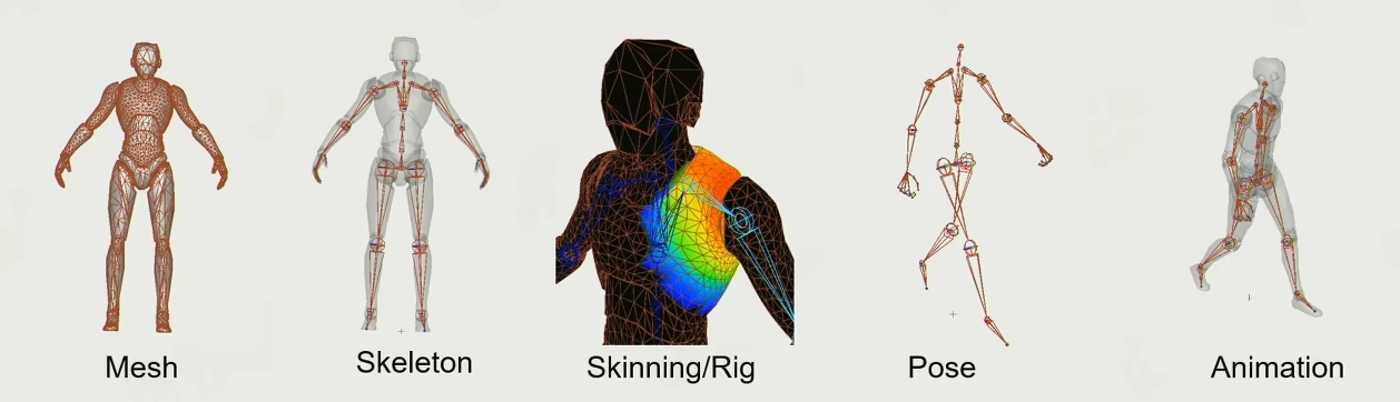 一套动画资源可能包括:骨骼信息、动作信息、蒙皮信息、数据文件等