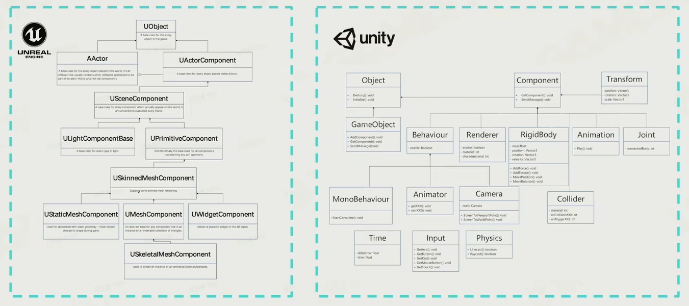 为了应对继承带来的一些问题,现代游戏引擎提供了组件化的开发方法,将行为/能力拆分到组件中,然后添加到对象上