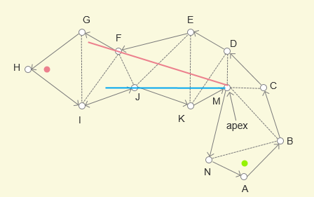 绿点作为起点,被包括在三角形 ABN 中,首先定位到下一个三角形是 NMB,那么公共边 NB 是一定要经过的,所以将 XN 作为左边界,XB 作为右边界,形成一个漏斗形状