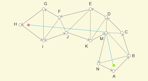 BCM 边界上,N 没有,所以先动 左边界 XN,左边界变成 XMXM 和 XB 形成的漏斗比原来小,则 XM 形成新边界XB 变更为 XC,由于 XM 和 XC 形成的漏斗更小,所以右边界变更为 XCKMD 边界上,所以先动 C 点,也就是右边界XD 和 XM 形成的漏斗更小了,所以右边界更新为 XDXM 更新为 XK,由于 XK 和 XD 形成的漏斗变大了,所以 XK 更新失败,退回到 XMXE 超过了左边界 XM,所以更新目标点,从 X 点变为 M 点,并将 M 点添加到最短路径中MD 更新为 ME,角度减少,右边界更新成功,变为 MEMK 更新为 MJ,角度减少,左边界更新成功,变为 MJME 更新为 MF,角度减少,右边界更新成功,变为 MFMJ 更新为 MI,角度增加,左边界更新失败,保持为 MJMF 更新为 MG,角度增加,右边界更新失败,保持为 MFMJ 更新为 MY (Y是终点),角度减少,左边界更新成功MF 更新为 MY (Y是终点),角度减少,右边界更新成功那么最短路径也就确定了,从 X(起点) -> M -> Y(终点)