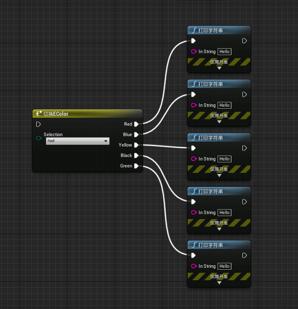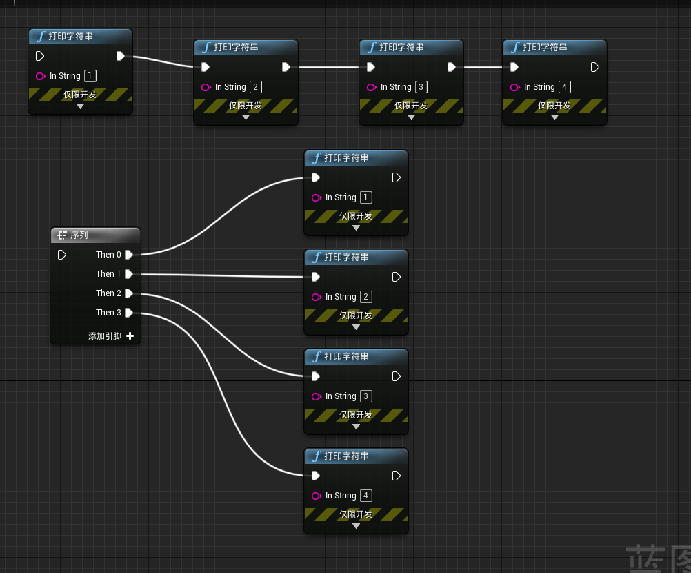 允许逻辑执行先进行分割,但不是并行关系,而是次序关系,最上层位于运行上端,以此类推 序列支持多个次序执行线并存,通过增加引脚来增加次序执行线 序列中的逻辑执行针脚是按照次序一次执行 目的是来帮助开发者将逻辑进行划分,可以将逻辑分成几块,而不必非要串联到一条逻辑线上,达到清晰逻辑结构的目的