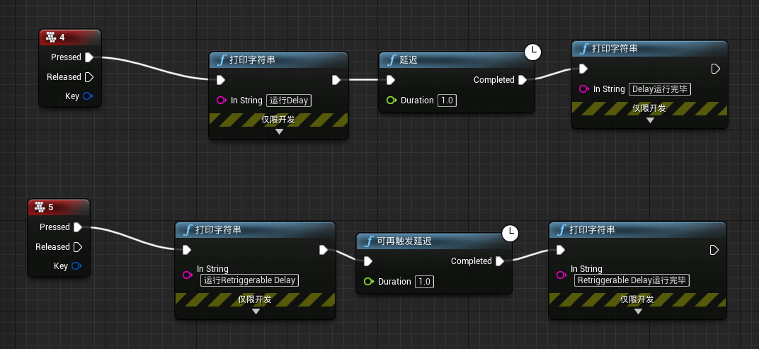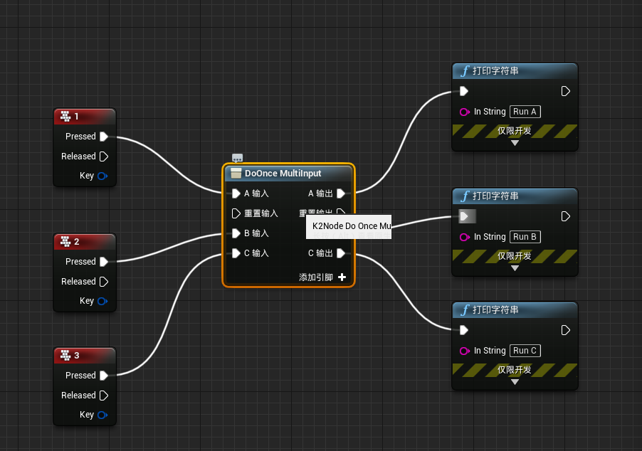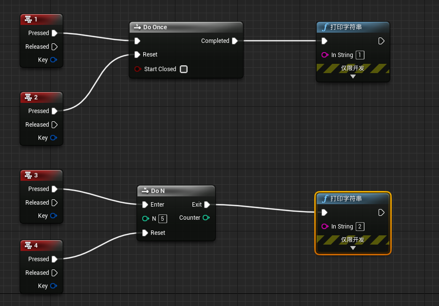 Do Once,最开始是激活状态,所以会输出字符串1Do Once之前已经执行过一次了,所以不会执行后续操作Do Once节点,使之重新进入激活状态Do N,设置Do N节点的N为5,所以点击五次3,才会使Do N节点失效Do N节点的次数与DoOnce节点基本相同,但是可以通过添加新的引脚,增加独赢的输入逻辑,只要任意逻辑输入针脚有调用,则整个节点被关闭
