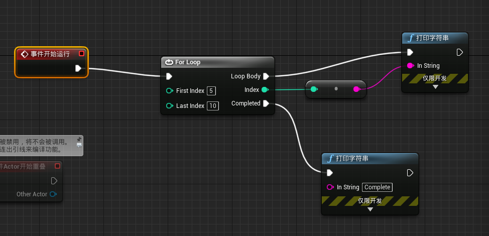 Index输出参数引脚将输出从开始到结束的所有整数,当整个节点执行完毕后,调用逻辑输出引脚Completed