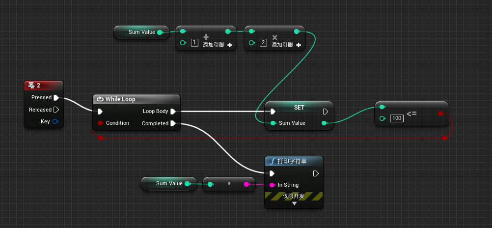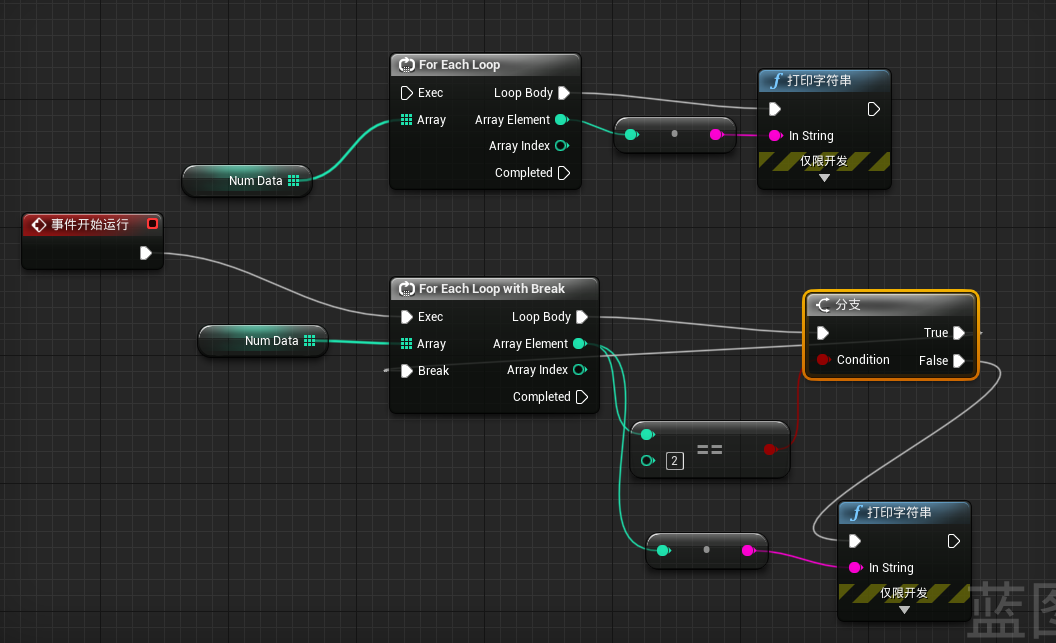 但添加了Break输出引脚,如果被打断则直接停止循环,跳到输出逻辑引脚Completed