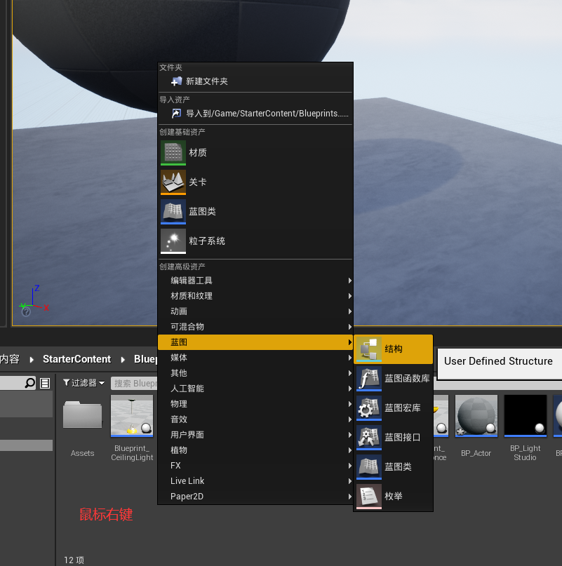 在目标文件夹(一般是新建名为BluePrints的文件夹)中右键,新建蓝图即可