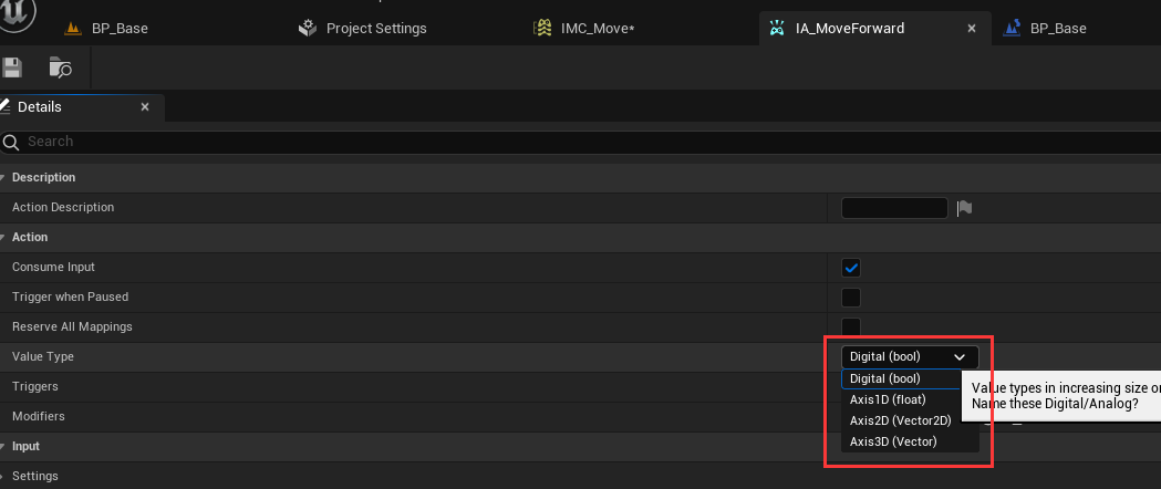 IA_MoveForward的配置,可以修改其触发事件传入的参数(当前是bool表示是否触发,可以修改为Axis1D来适配手柄)