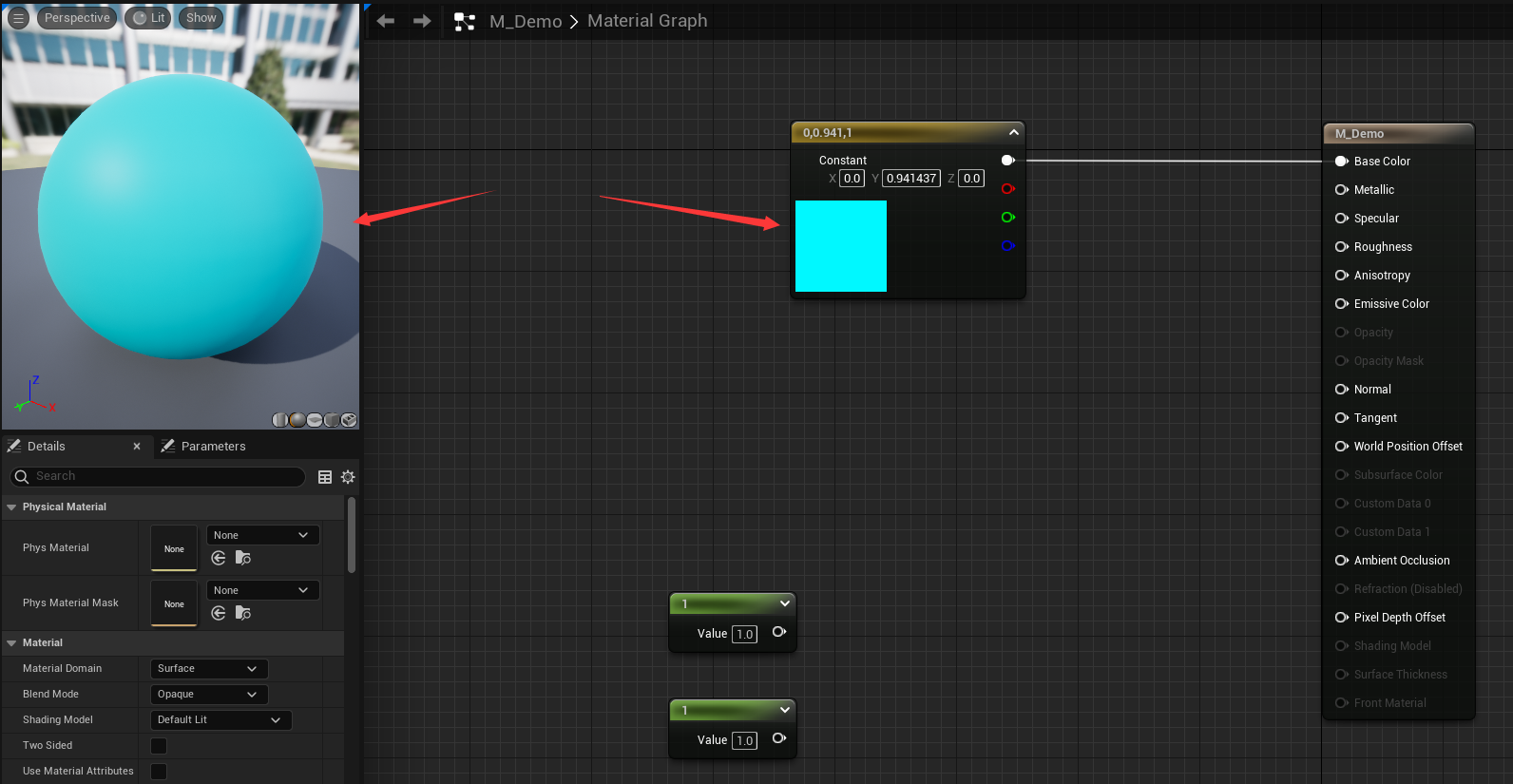 对比 (0.5, 0.5, 0) 的颜色和材质最后的表现效果就知道