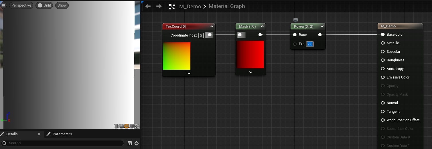 使用 UV 和 Power 节点可以发现分界线根据幂的值向右移动,这是因为 UV 节点的值从左到右是 0 到 1,幂值越大,结果越小,表现更黑
