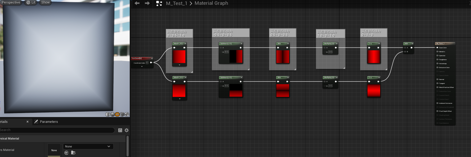 以上图为例,原本的 TexCoord 的数组是从 0~1 的,加上 Bias 配置的 -0.5 之后,得到的是一个 -0.5~0.5 的数组,然后乘以 Scale 配置的 0.5,最后得到一个的是一个 -0.25~0.25 的数组,这也就最后左边预览显示的效果