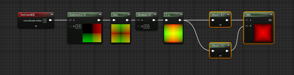 在 PhotoShop 中使用两个径向工具绘制的图层,使用变暗叠加,可以得到方形渐变的效果,同理在 UE 中可以使用两个镜像的效果叠加变暗的计算,也可以得到方形渐变