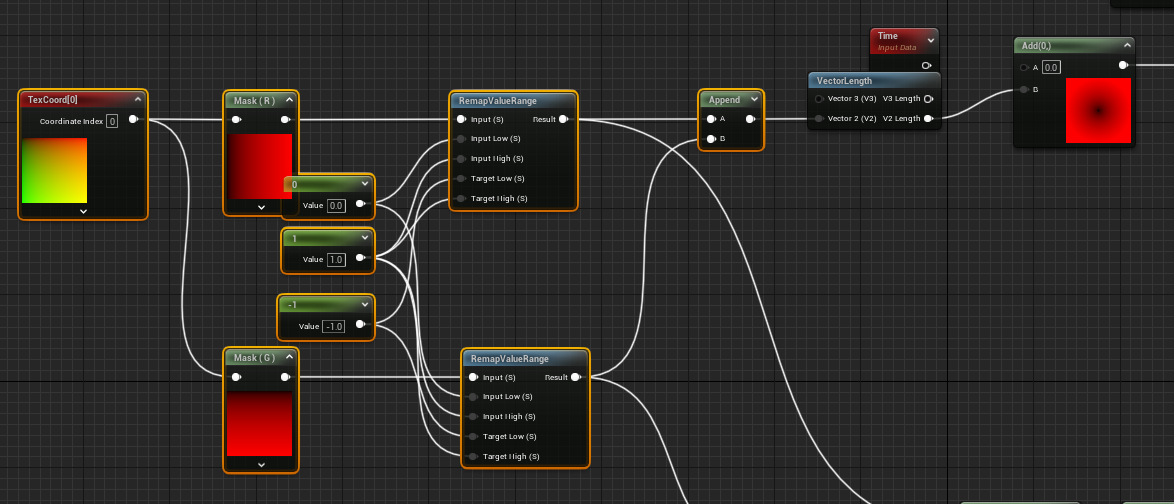 使用 RemapValueRange 将值从 0 ~ 1 变成 -1 ~ 1, 然后通过 Append 合并成二维向量 (-1, -1) ~ (1, 1),再使用 VectorLength 得到其相对 (0, 0) 点的距离的一维值